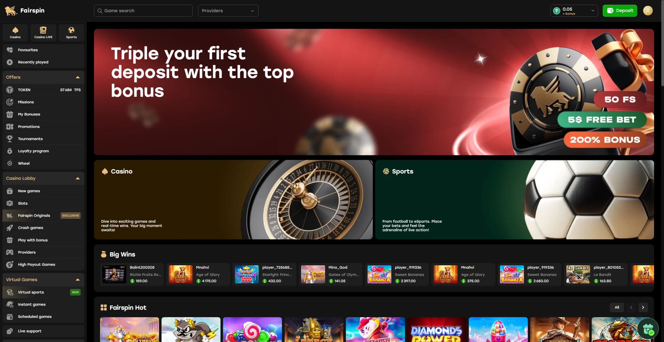 The welcome bonuses at Fairspin are activated after your first deposit and can be used on a multitude of games, including slots, table games, and other categories. The inclusion of Free Spins further increases your winning chances, providing additional opportunities for big wins right from the start. Additionally, the bonus redemption process is simplified, allowing you to begin playing immediately.